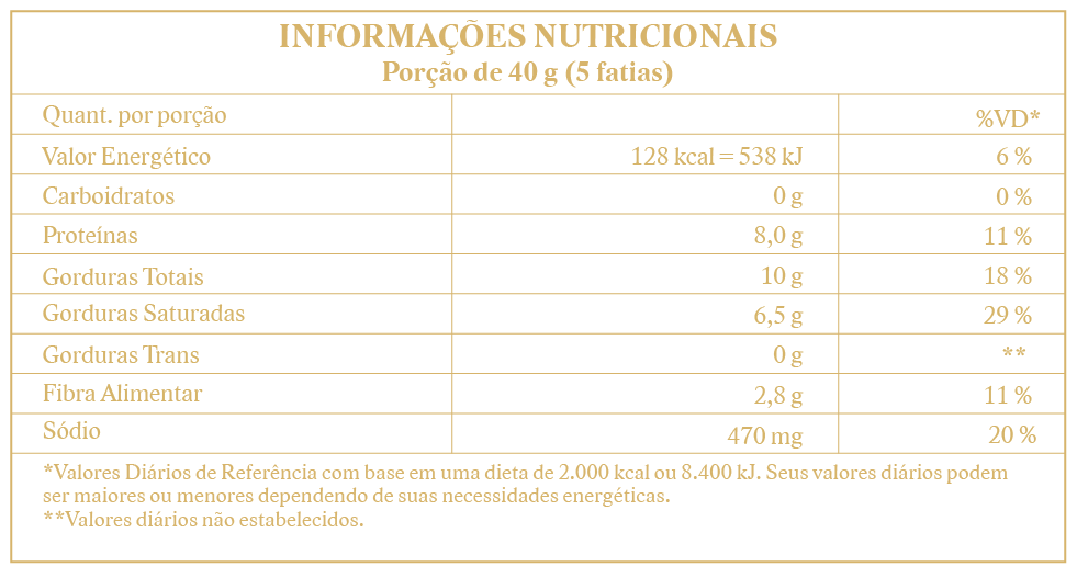 Ingredientes: carne suína, gordura suína, sal, açúcar, glicose, vinagre, alho, pimenta, eritorbato de sódio INS 316 (antioxidante), carmim de cochonilha INS 120 (corante natural), acído cítrico INS 330 (acidulante), nitrito de sódio INS 250 e nitrato de sódio INS 251 (conservantes). NÃO CONTÉM GLÚTEN.