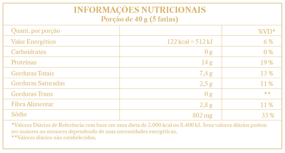 Ingredientes: carne suína, toucinho, sal, açúcar, glicose, pimenta, alho, vinho, coentro, cultura starter, eritorbato de sódio INS 316 (antioxidante), ácido cítrico INS 330 (acidulante), nitrito de sódio INS 250 e nitrato de sódio INS 251 (conservantes). NÃO CONTÉM GLÚTEN.